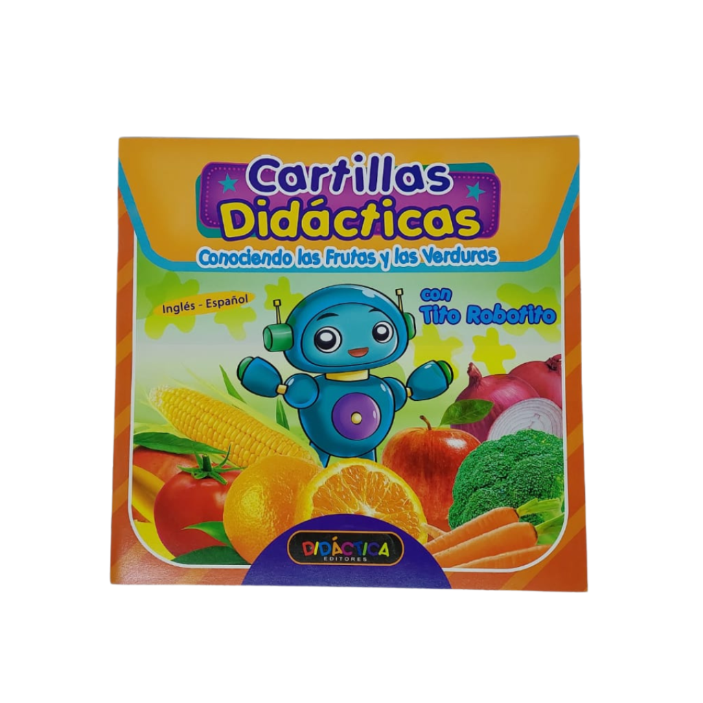 Cartilla educativa. Tamaño 24 x 23cm. 11 Páginas. Conociendo las frutas y las verduras «con Tito Robotito». Dúplex plastificado.