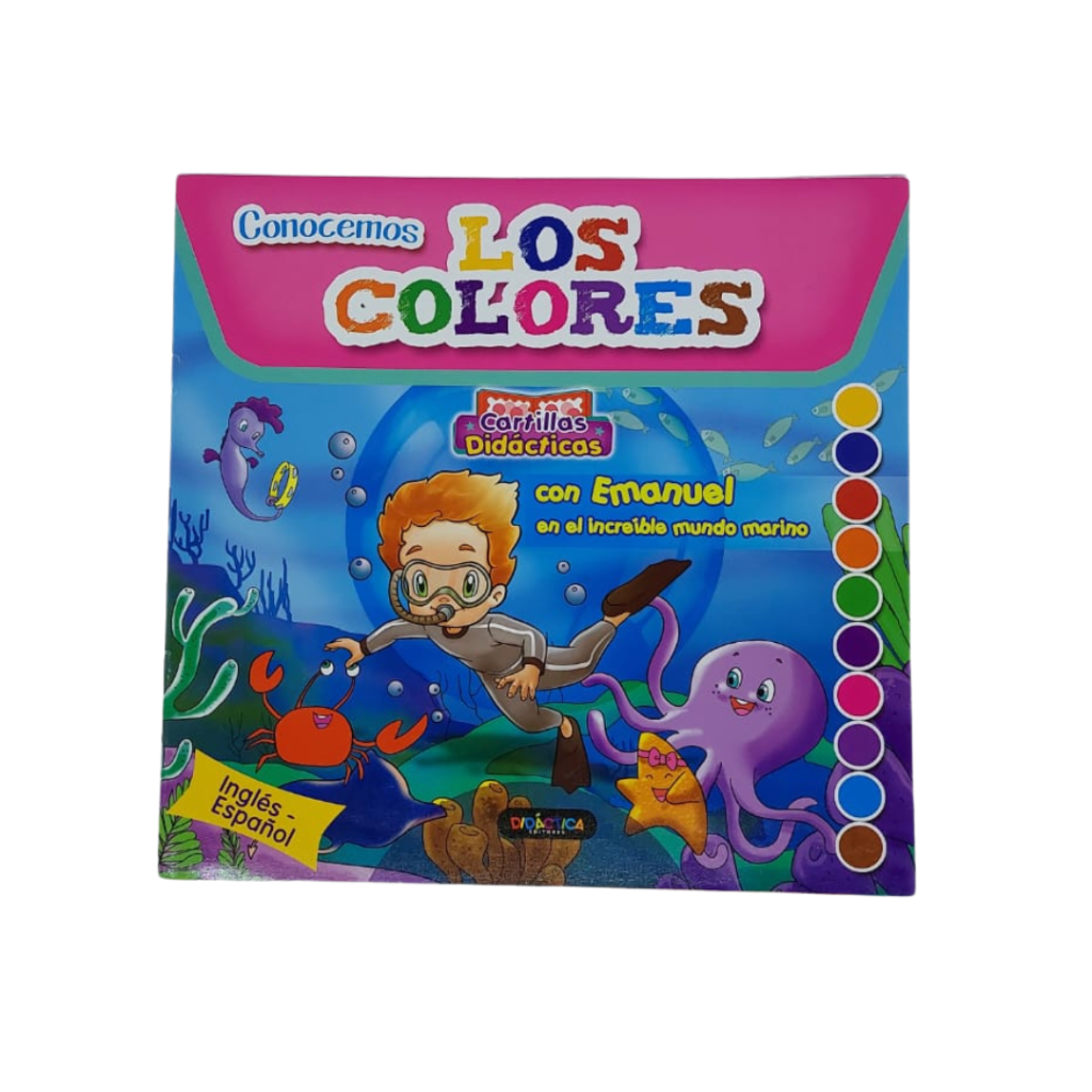 Cartilla educativa. Tamaño 24 x 23cm. 12 Páginas. Conociendo los colores «con Emanuel» en el increíble mundo marino. Dúplex plastificado.