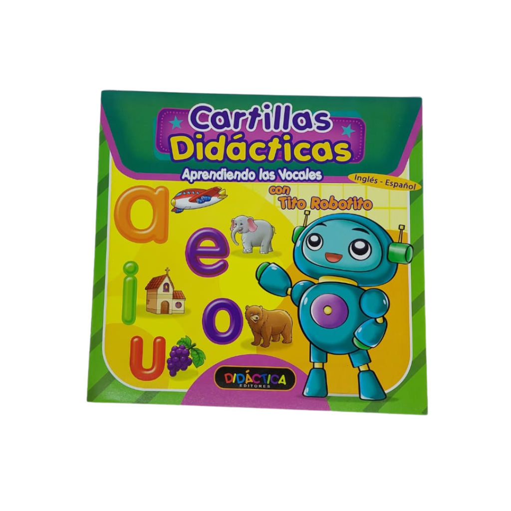 Cartilla educativa. Tamaño 24 x 23cm. 11 Páginas. Aprendiendo las vocales «con Tito Robotito». Dúplex plastificado.