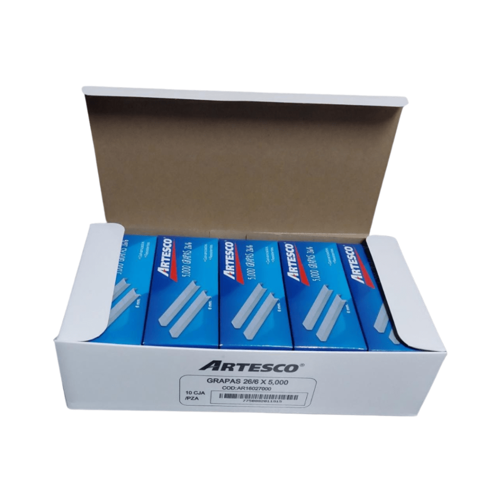 Grapas 26/6. Incluye: 5000 unidades. Marca: Artesco. Caja x 10 Unidades. Imágenes referenciales.
