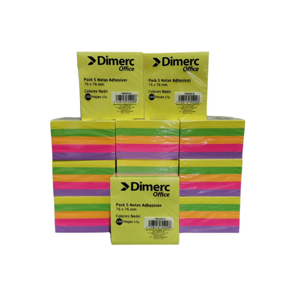 Pack 5 Notas Adhesivas. Colores Neón 76 x 76 mm. 100 Hojas c/u. Marca: Dimerc. Caja x 12 Unidades. Imágenes referenciales.