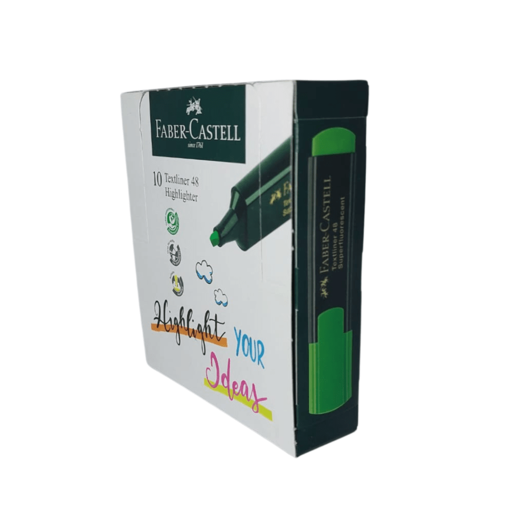 Resaltador Textliner 48. Punta biselada. Marca: Faber Castell. Color: Verde. Caja x 10 Und. Imágenes referenciales.