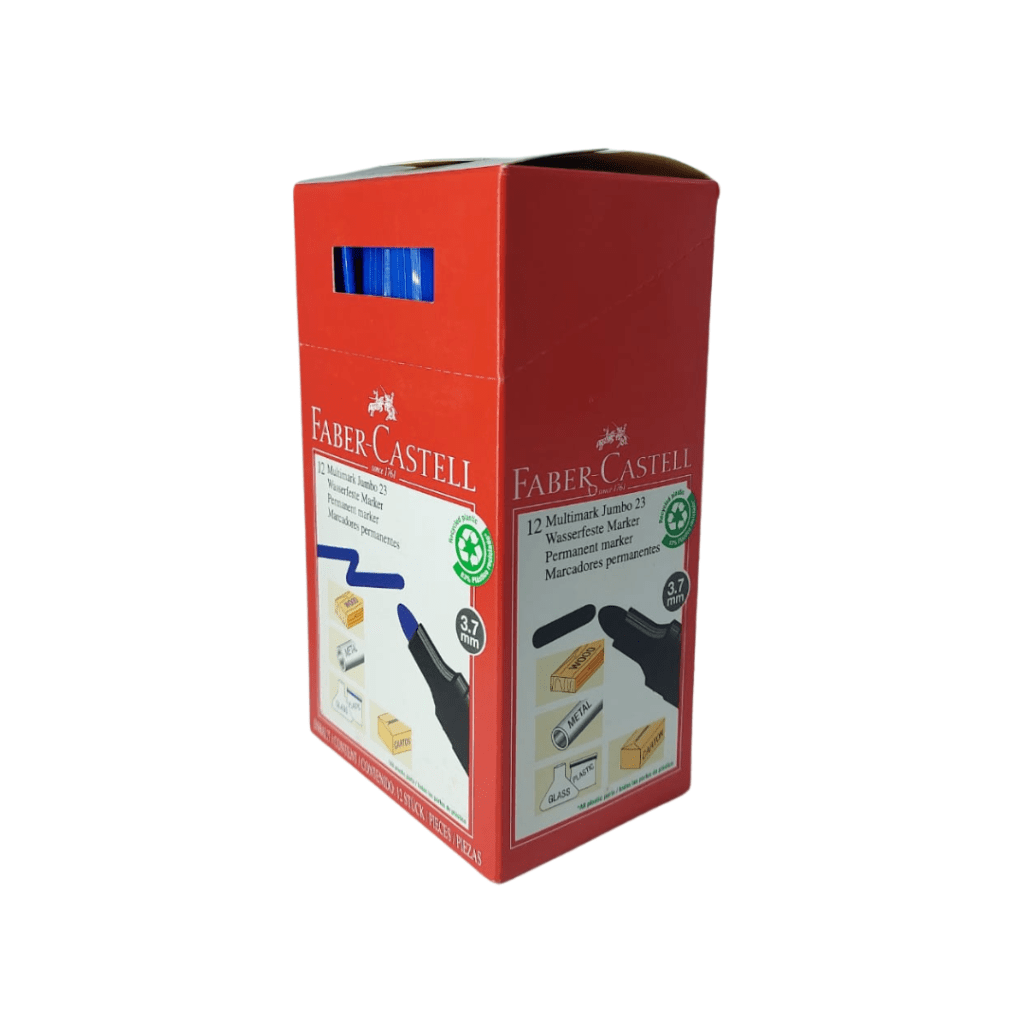 Tinta permanente. Punta gruesa redondeada de 3.7 mm. Tapa con clip. Color: Azul. Caja x 12 Und. Imágenes referenciales.